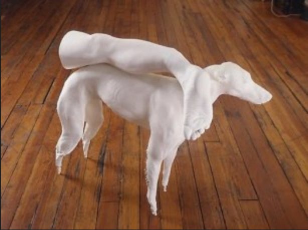 Greyhound Carrying My Broken Leg (1997) is perhaps the most well-conceived work in the exhibition. The naturalistic figure of an average greyhound dog stands erect in the center of a square room, balancing perfectly upon its back the lower leg and foot of a man. Vital explains this as the leg he broke when skiing as a boy in his native Switzerland. In the history of representation, the greyhound has never referenced labor; they were the pets of the wealthy and privileged. The dog’s face lacks vitality, becoming dreamlike and enigmatic, presenting Vital’s interest in the opaque aspect of sculpture.