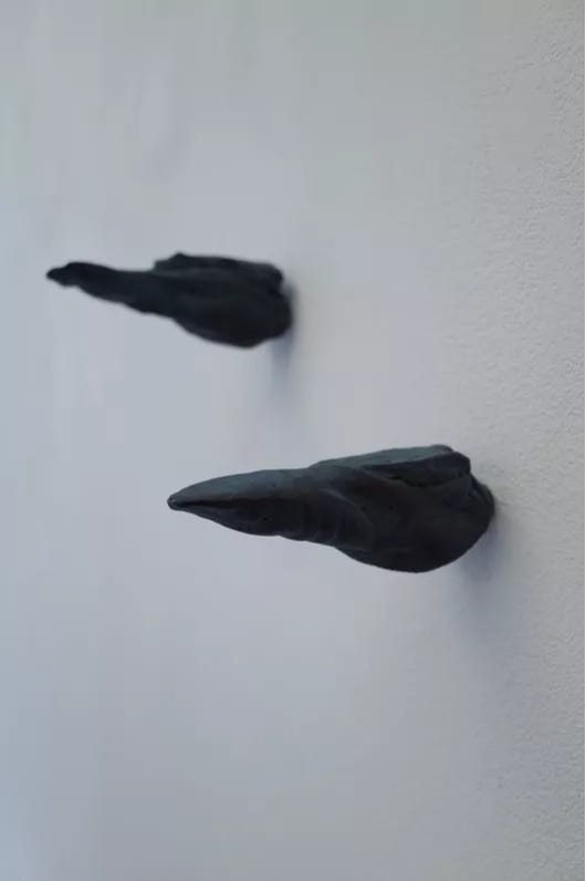 Much of this exhibition focuses more generally upon the idea of reference than the motif of the universal animus represented between man and animals. The present direction of his work seems to bend more and more toward a pure understanding of the ideas behind form. This is achieved not through a mindless repetition in the casting of forms, but in a narrative process of thematic sculpture, what Claude Ritschard calls Vital’s "binary" process of alternating his concerns between perceiving the figures as drawing and as icons. This is exemplified in all manner of forms, whether large or small, whether essentially iconic as sculpture as within the context of a an installation. Small Tongue (1996-97) is a good example of this. Modeled from the real object, it achieves a singular effect over the wall space of the entire gallery with hundreds of models made from unique originals. The tongue’s function is to punctuate the infinite experiential space of the gallery by impinging upon a free visual field. The tongue can be seen as a protrusion or visitation of animal consciousness, or as a tasting of experience by the animal persona not otherwise present. This creates a feeling of anxiety in the viewer, unsettled by the presence of an incomplete being whose absence is in some manner his or her fault.