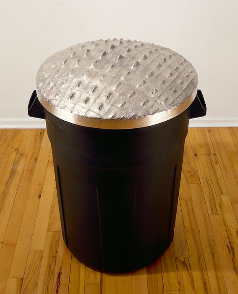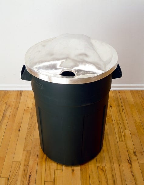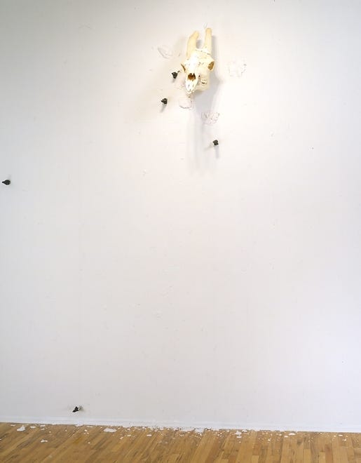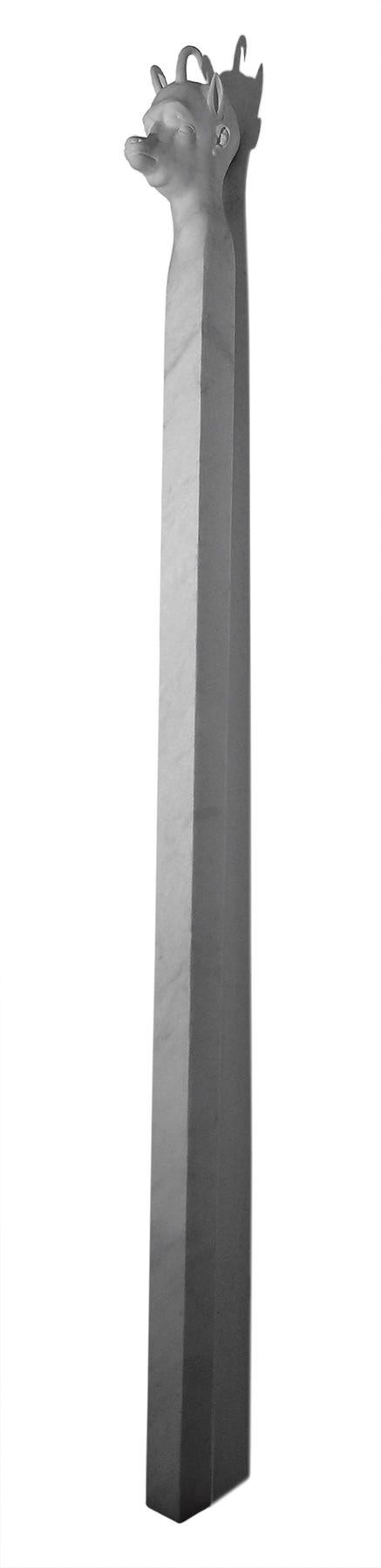 1/2 Man 1/2 Animal (1996) presents characteristics of each species as combined atop a tall totem pole otherwise unadorned, and smooth to the touch. The face at its top resembles no man and no animal that we know well. In Snowballing The Giraffe (1997), the skull of a giraffe, hung the height of a living animal, has been made the target of snowball target practice. This work projects an impression of warmth; the dead skeleton of an animal defies the violence made upon its last extant form. Yet its placement beside the other sculpture seems more than merely idiosyncratic.