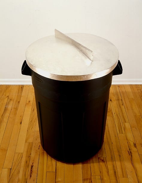 In his current exhibition, the streamlined sculptures of Not Vital continue to embody a union of conceptual and formal ends. One series of works attends to the biological imperatives of history and prehistory. Minus, Zero, and Plus (1996-97) each consist of green rubber garbage cans with modified silver covers. Each cover has been made to represent one level of human evolution with a single representative design. Minus shows the rough, studded hide of a dinosaur or early prehistoric animal; Zero, the exact replica of a man’s rear torso; and Plus, a plain, smooth cover except for a single square and solid spine, like a reduced and futuristic dorsal fin. Each of these sculptures relates to an idea of our physical existence and attends to ideas about our skin, how our coverings makes us what we are in time, organisms altogether vulnerable. They also apply to man’s development in history as being biological in addition to cultural. In representing the present epoch in human evolution by the rear view of man, titled Zero, does Vital mean to infer that we are nothing now, or merely that our present state is only qualified by a leap into chronological distance? There is a sense palpably expressed here that the future holds promise, for then we are Plus. What would being Minus qualify us for? Vital does not preach nor does he let on as to his intention. We are left to feel that any judgments on man as a species are arbitrary at best. What remains is the vision of the artist.